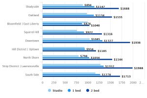 • Shadyside is Pittsburgh’s largest and most expensive apartment market, where a one-bedroom apartment in a recently constructed building has an average asking rent of $1,649 a month.